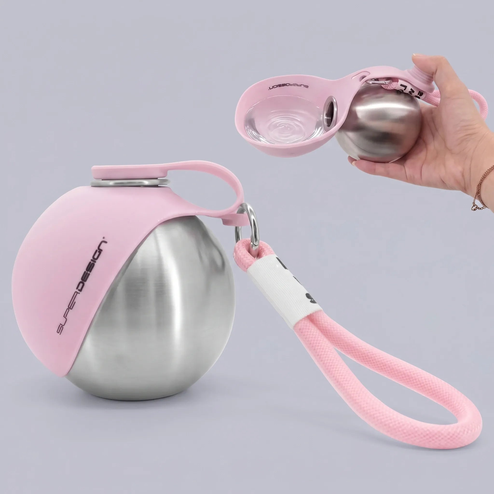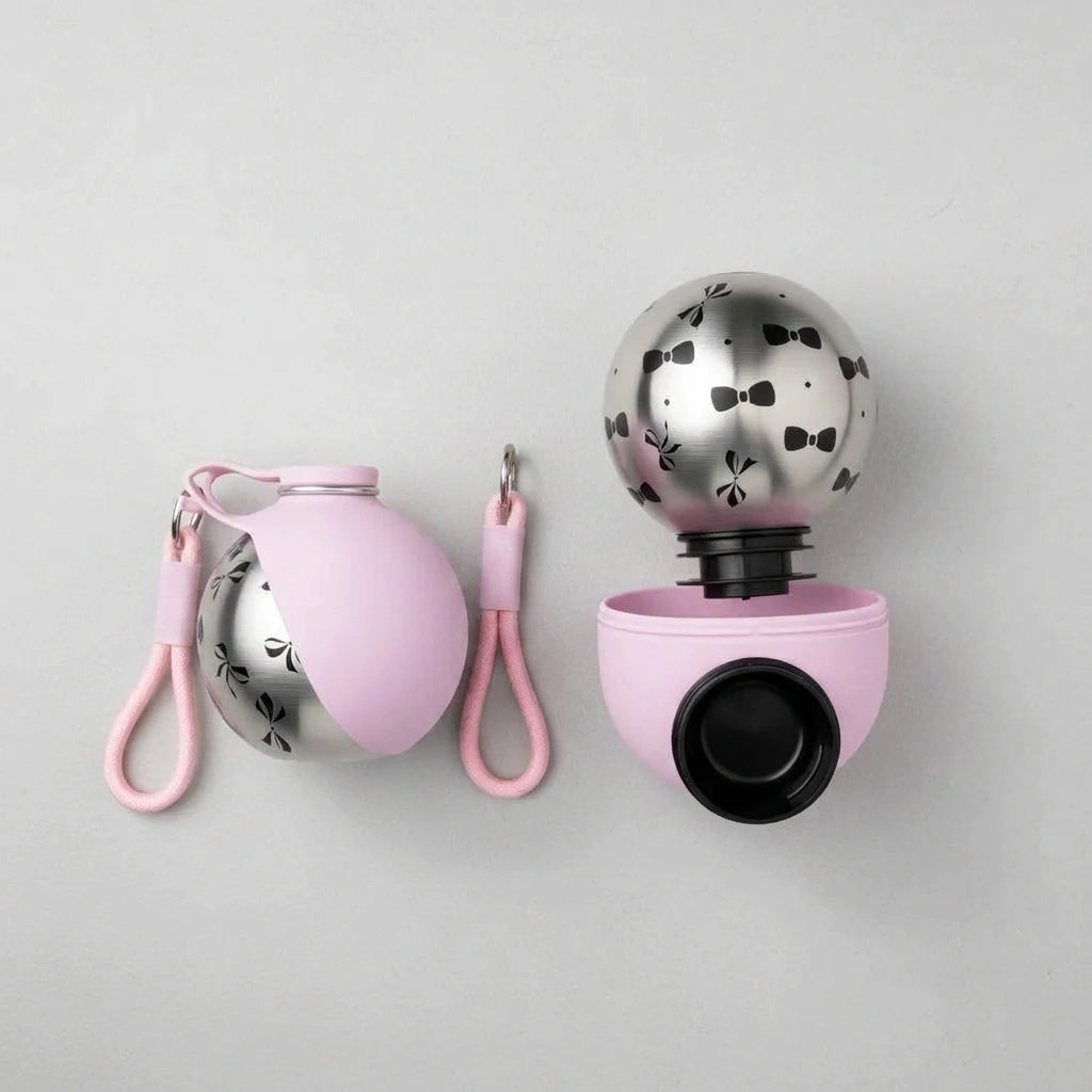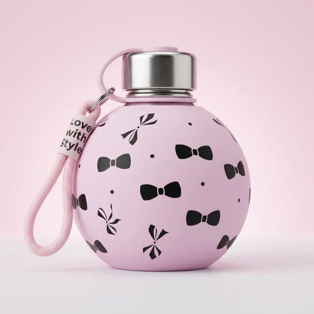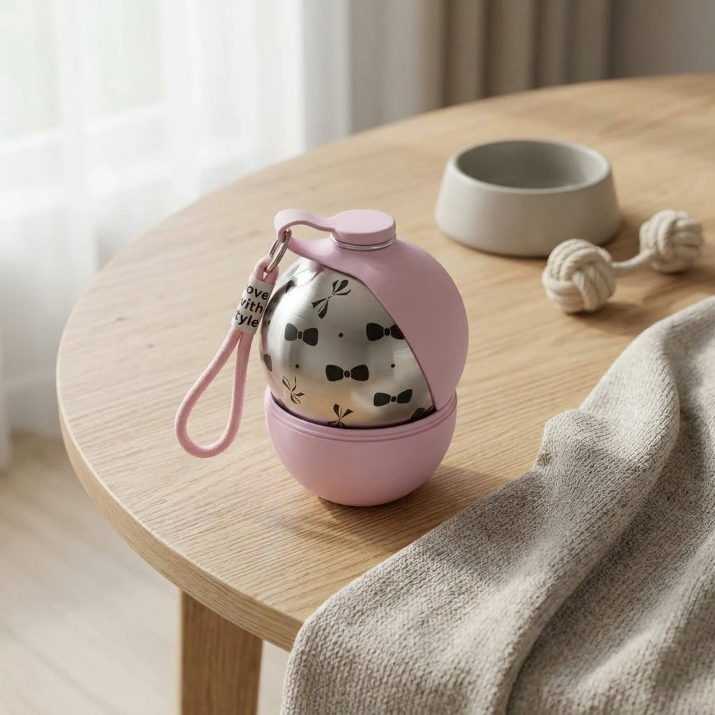 It's the perfect blend of fashion and function! With its unique spherical design, elegant bow pattern, and practical features like the 'Love with Style' strap, it's more than just a bottle—it's a statement of care and style for you and your pet.