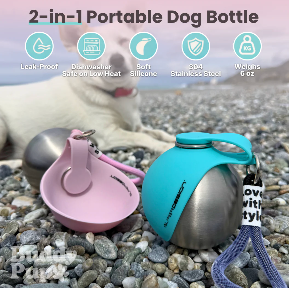 Conçue pour un confort optimal, la bouteille BuddyPup™ est dotée d'une sangle confortable « Love with Style » et d'un design sphérique léger qui tient parfaitement dans votre main ou votre sac. Hydrater votre chiot en déplacement n'a jamais été aussi élégamment simple !
